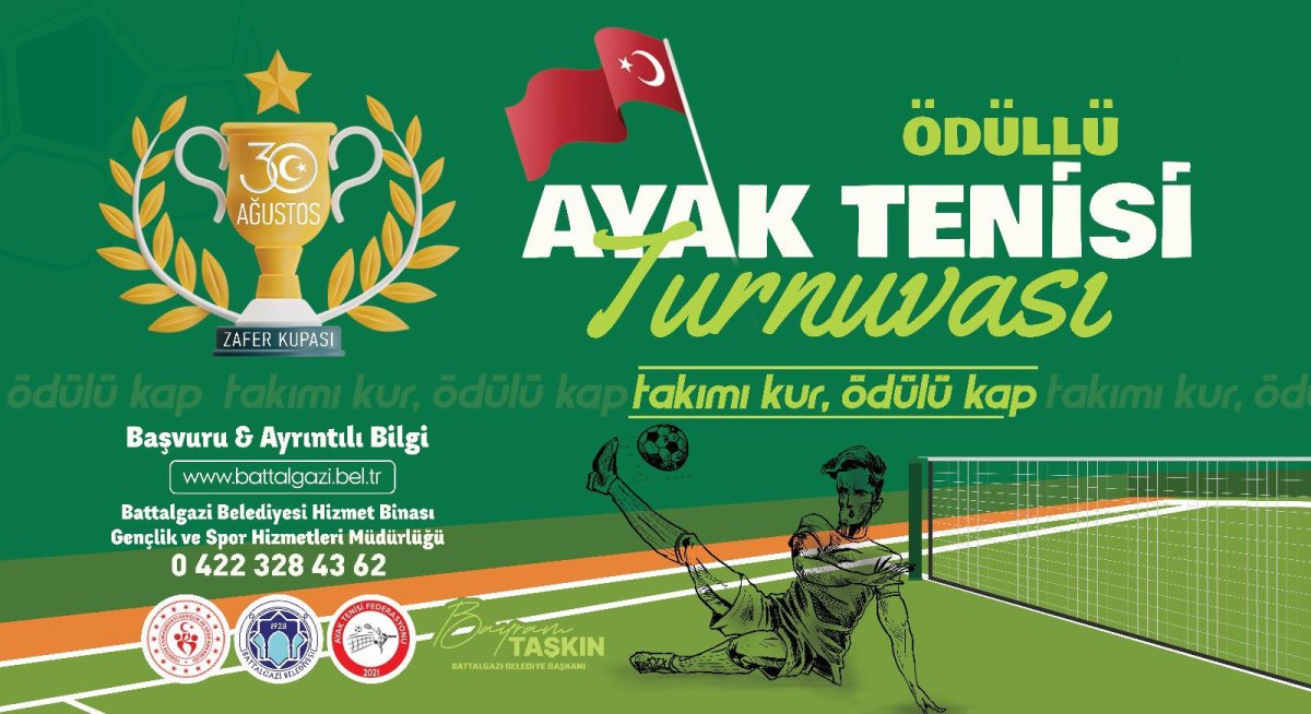 Battalgazi Belediyesi Gençlik ve Spor Hizmetleri Müdürlüğü tarafından Ayak Tenisi Turnuvası düzenleniyor. 30 Ağustos Zafer Bayramında final maçı oynanacak turnuvaya son başvuru tarihi 22 Ağustos.
