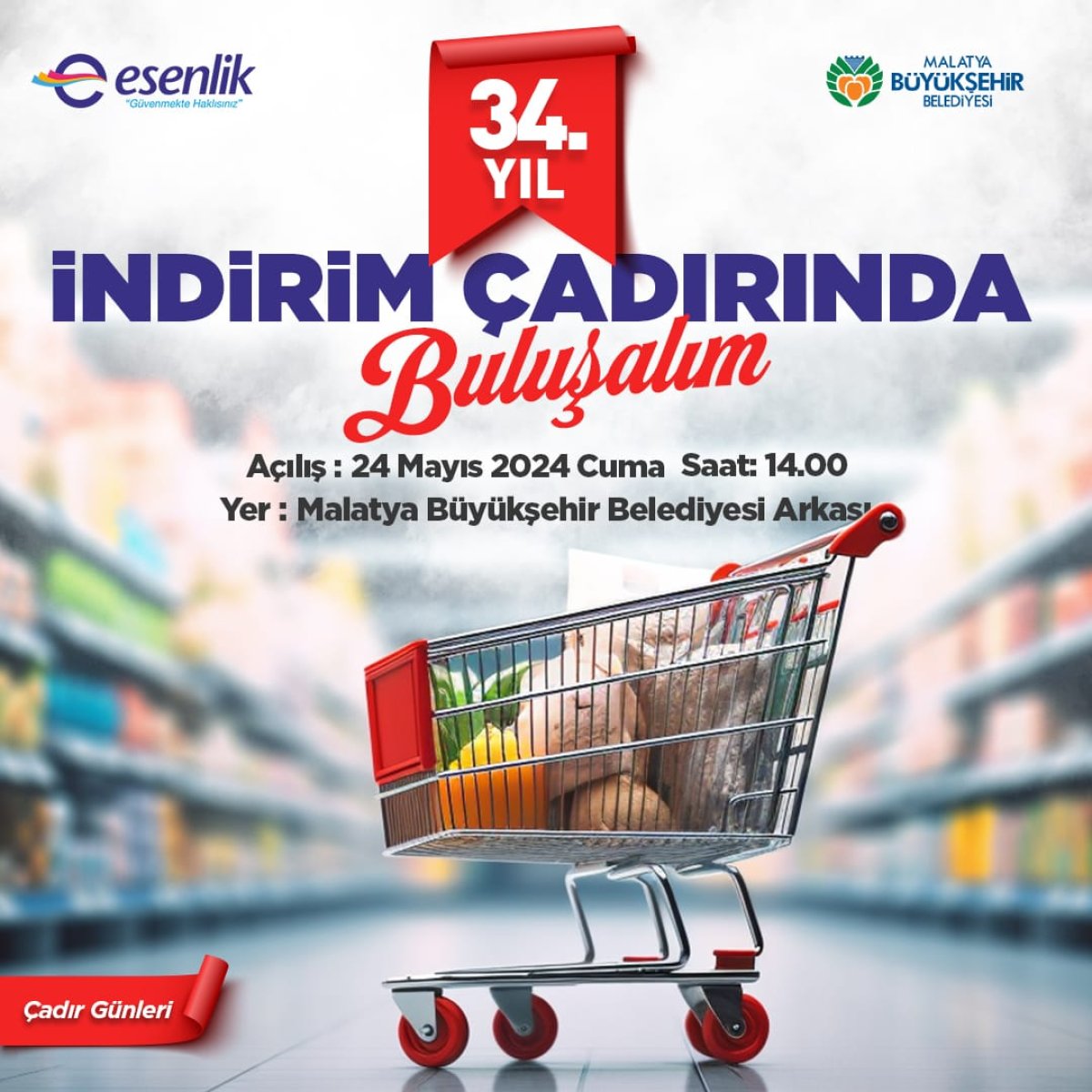 Esenlik Marketler, 34. kuruluş yıldönümüne özel düzenlediği kampanya ile müşterilerine büyük bir indirim fırsatı sunuyor. Malatya Büyükşehir Belediye arkasında 24-30 Mayıs tarihleri arasında, toplam 7 gün sürecek olan indirim çadırında, stoklar her gün eşit miktarda satışa sunulacak.